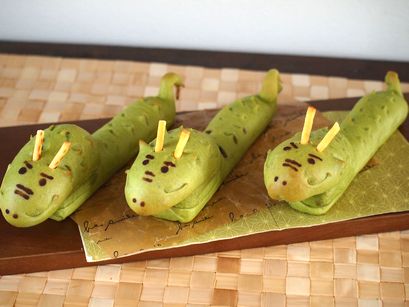 抹茶生地に餡子を包み込んだ辰に見えなくもない可愛いパン♪年始のご挨拶パンにもいいかも♪